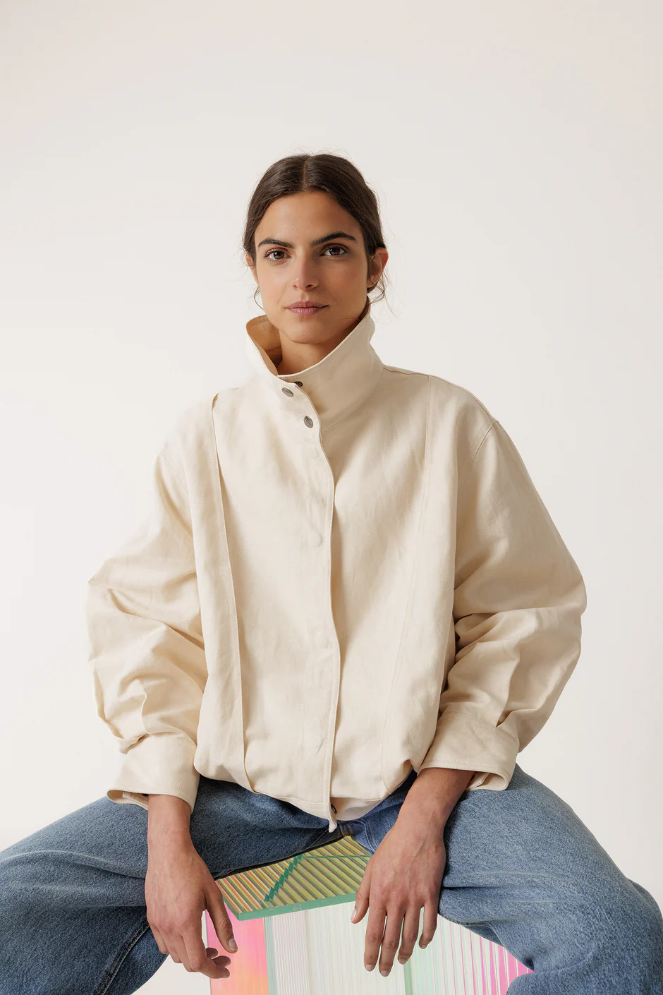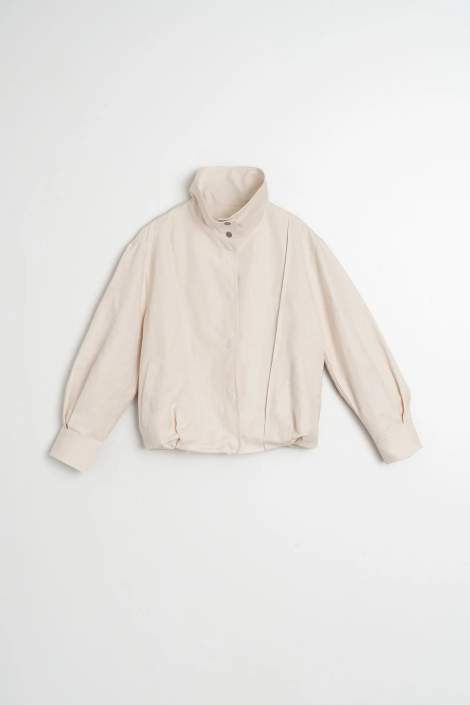 Puhvvarrukatega kreemikas värvitoonis linase ja puuvilla kooslusest bomberjakk. Jakil on kõrge kaelus, taskud ja trukkidega kinnitused. Tõeline pilgupüüdja jakk, mis sobib ideaalselt erinevate kleitide-seelikute kui ka teksapükstega kandmiseks.