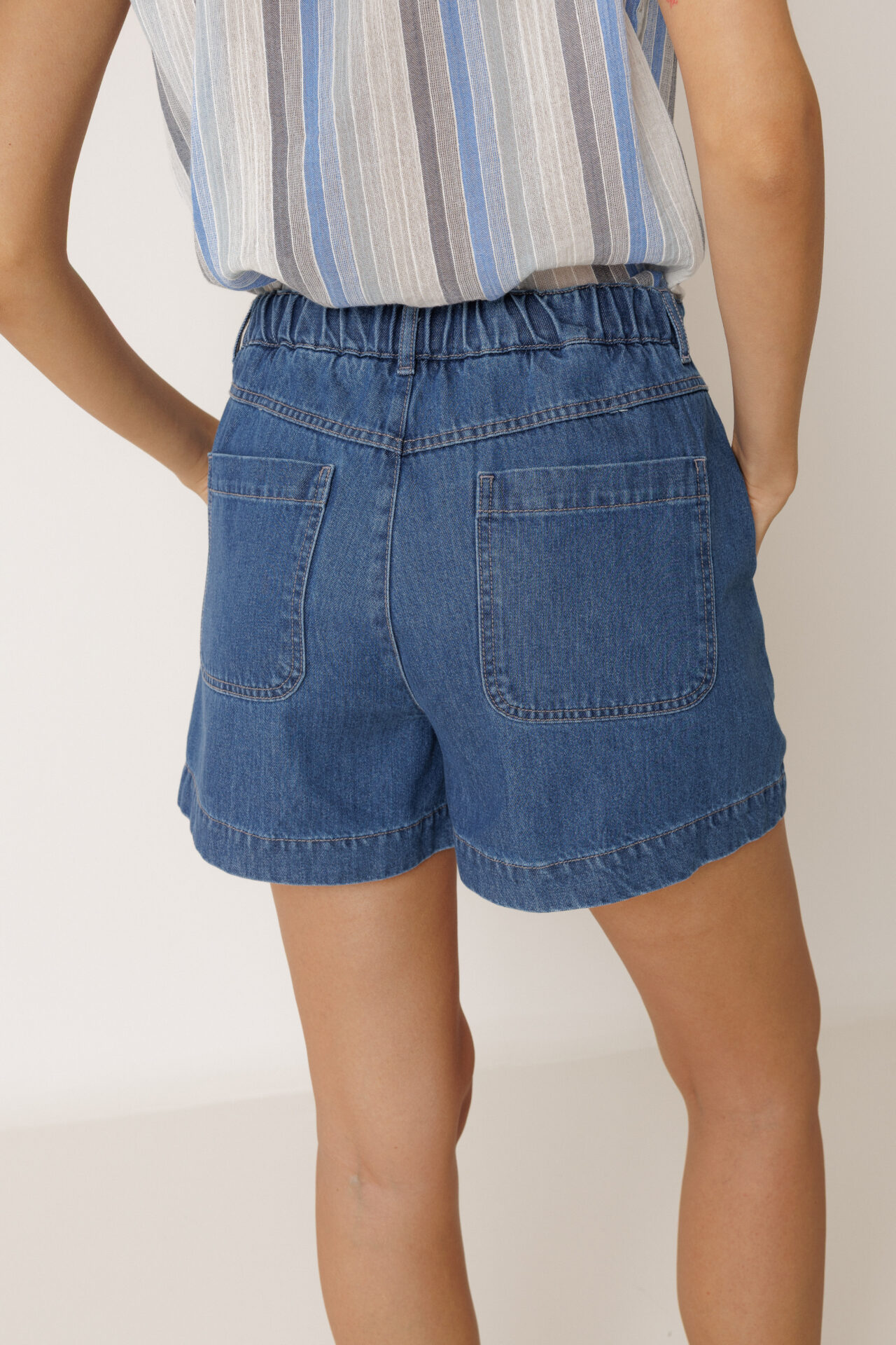 Linase ja puuvilla kooslusest lühikesed teksapüksid. Väga mugav tegumood ja pehme materjal. Rohkete taskutega mudelil on parema istuvuse tagamiseks värvli seljaosas kumm.