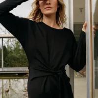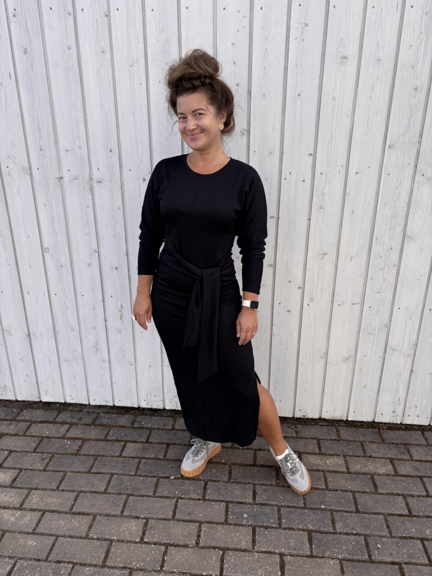 Langeva õlalõikega dressikleit, mis näeb välja šikk ja väljapeetud. Tõeline pärl Sinu garderoobis! Materjali sisalduses olev modaal annab kangale siidise pealispinna ja hea langevuse. Kleidil on ühel külje lõhik ja ees külje peale seotav kinnis, mis loob visuaalselt meelitava silueti.